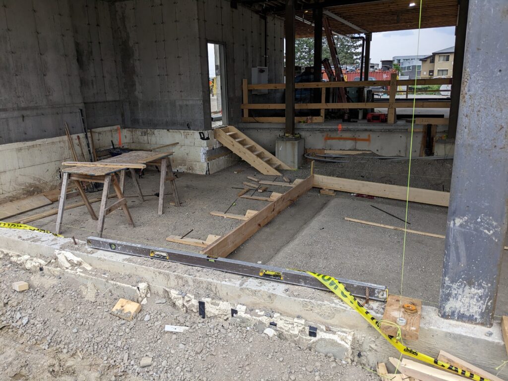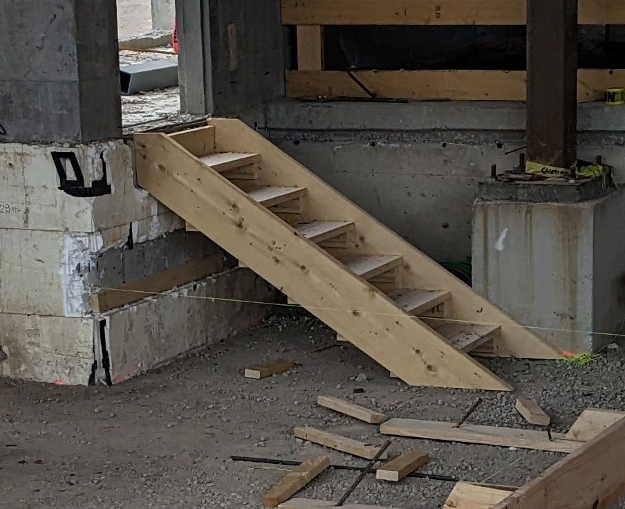 This was a simple temporary stair I built for one of our formwork crews – obviously unfinished, with the railing yet to be added. A simple calculation of my total rise, divided by a perfect world 7″ gave me something like 6.879 risers. Rounded that up to 7 risers. Knowing my top riser delivers me up to ground level, I know I’ve got 6 treads. Using 10.5″ for tread depth, I know how to mark out the stringers. Since I had 2x10s at the ready I didn’t cut the stringer and used cleats to support the treads also providing ample material to attach handrail to. Because of landing the stair on uneven ground, I cut them 2″ long, dry-fit the stringers in place and scribed the bottom to ensure a level fit. On a side-note, I was also responsible for the formwork for the retaining wall just beyond the column footing.